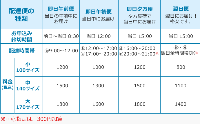 即日午後便のみの取扱いです。料金は、全サイズ一律2300円